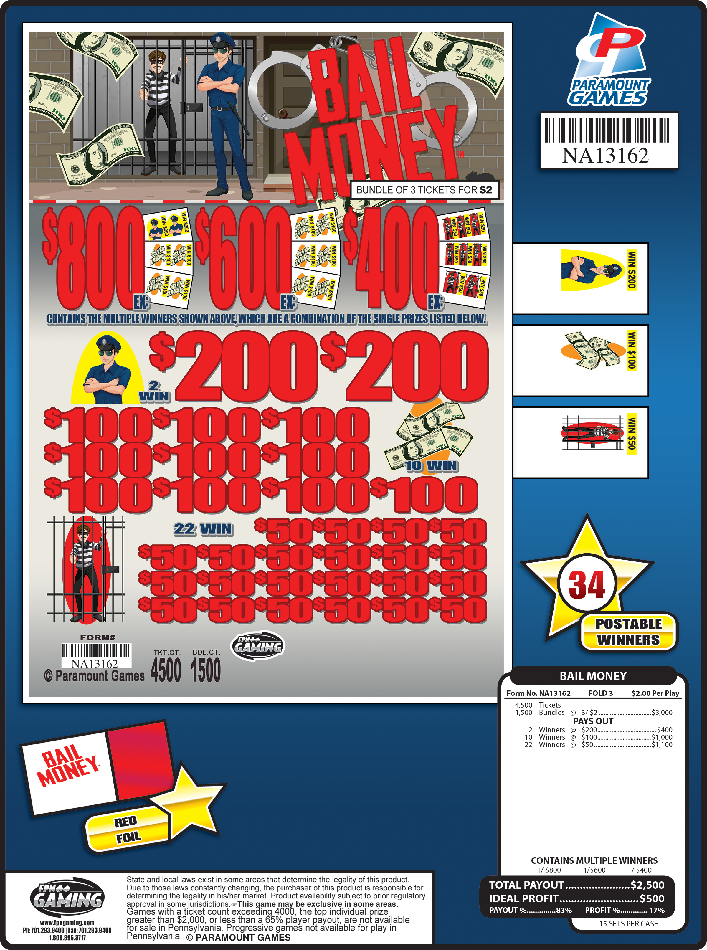 1500 tickets, Red Foil Total Payout - $2,500 Ideal Profit - $500 Payout % - 83% Profit % - 17% 15 Deals/Case