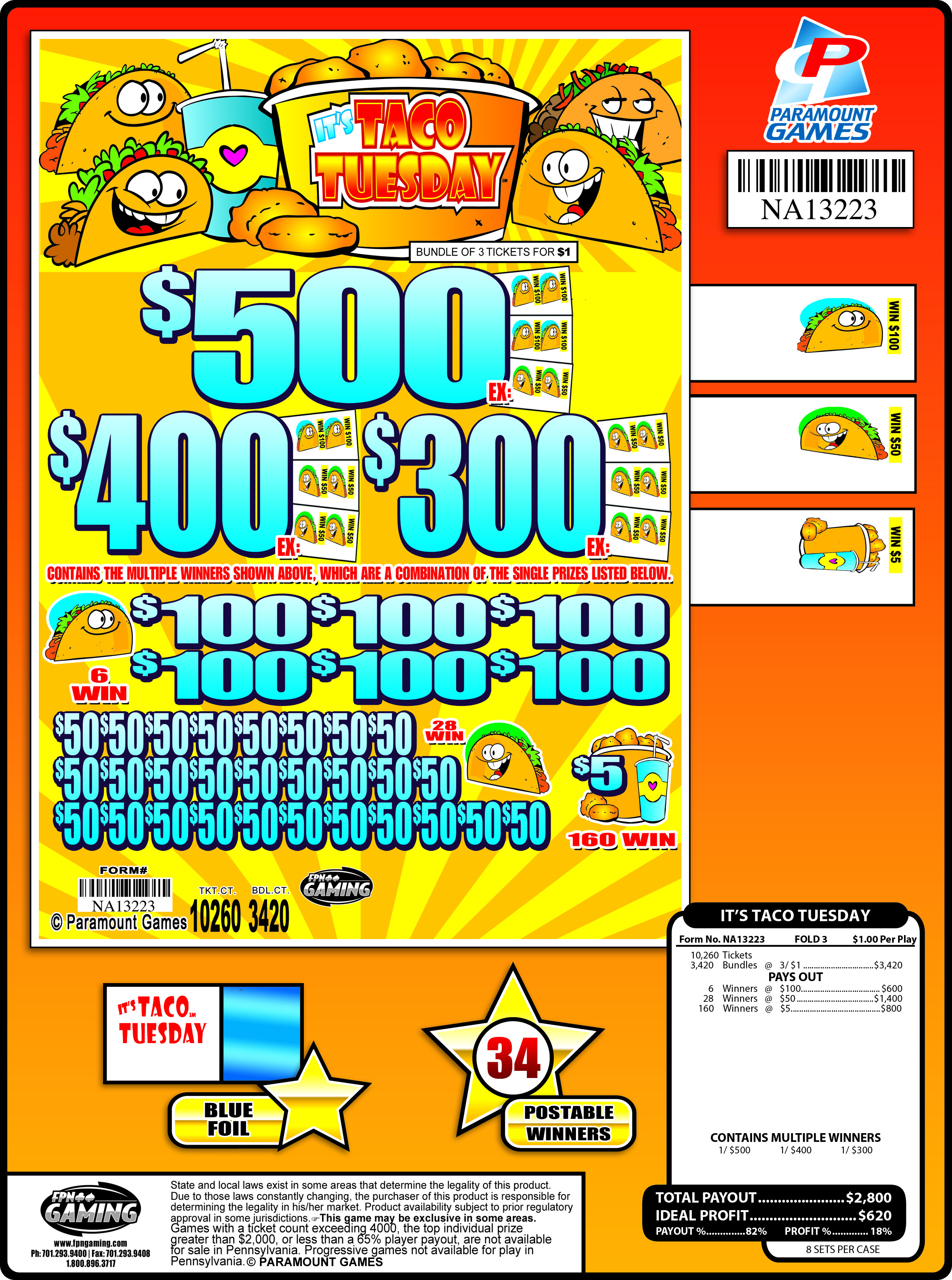 3420 tickets, Blue Foil Total Payout - $2,800 Ideal Profit - $620 Payout % - 82% Profit % - 18% 8 Deals/Case