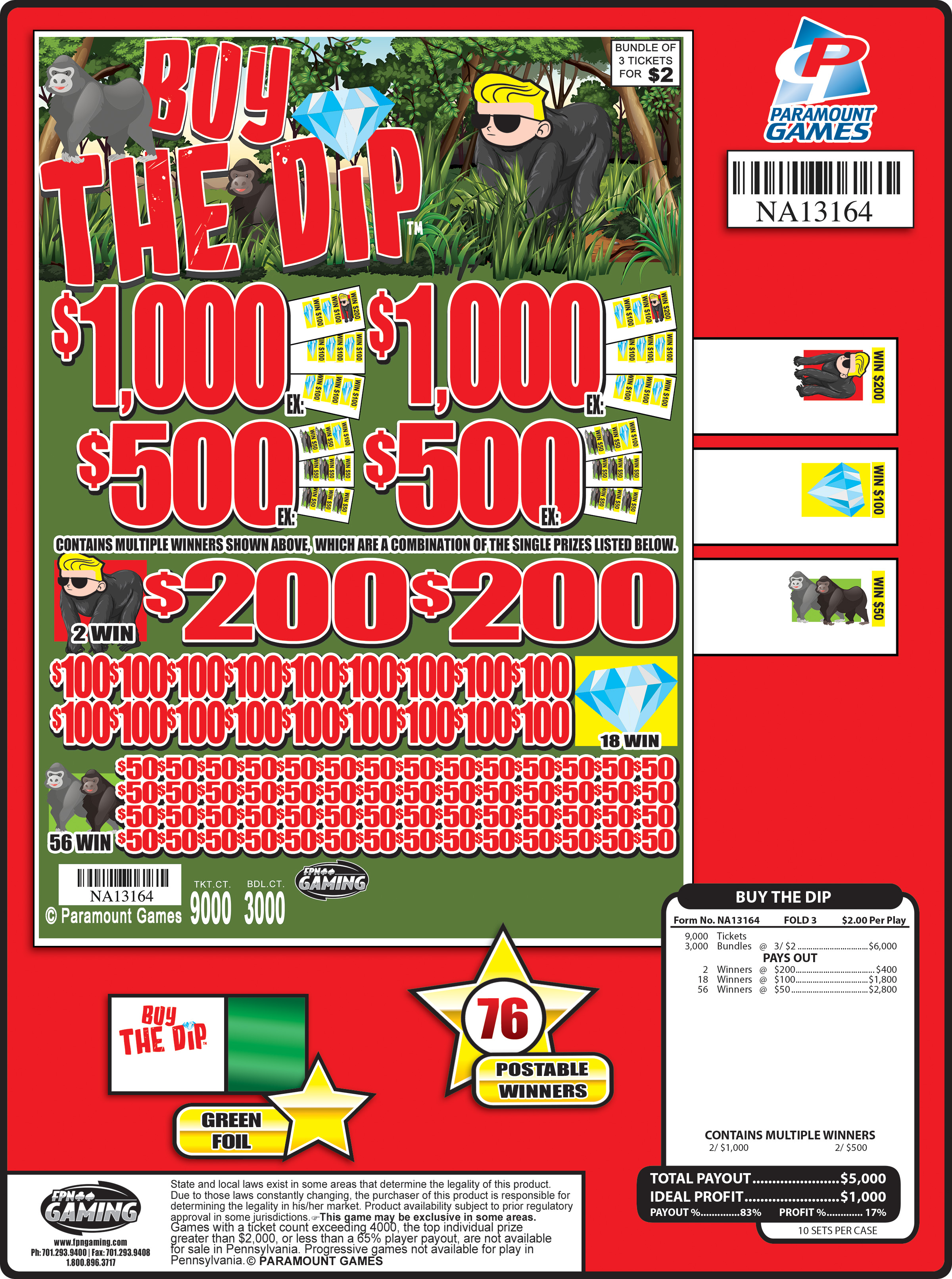 3000 tickets, Green Foil Total Payout - $5,000 Ideal Profit - $1,000 Payout % - 83% Profit % - 17% 10 Deals/Case