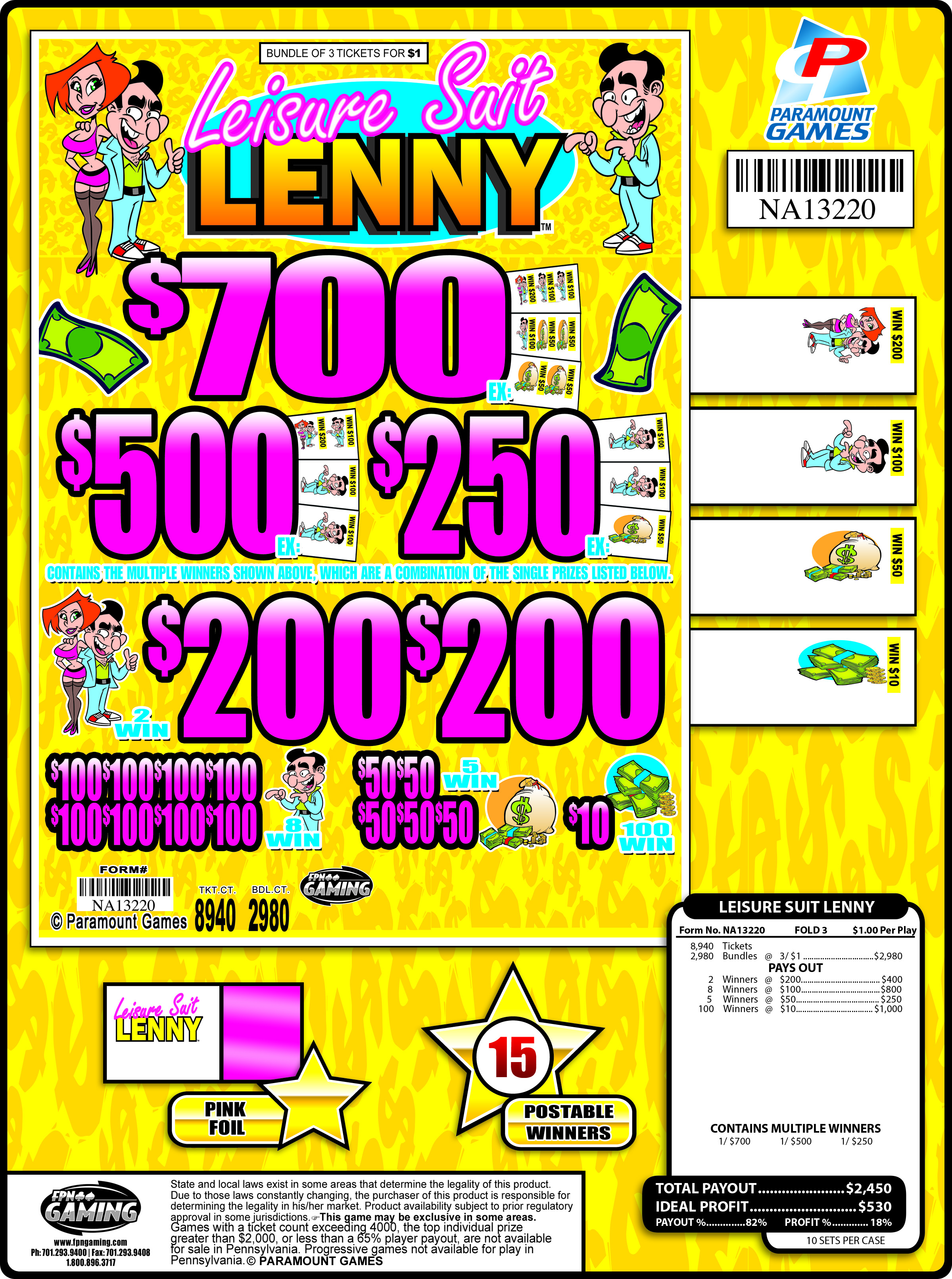 2980 tickets, Pink Foil Total Payout - $2,450 Ideal Profit - $530 Payout % - 82% Profit % - 18% 10 Deals/Case